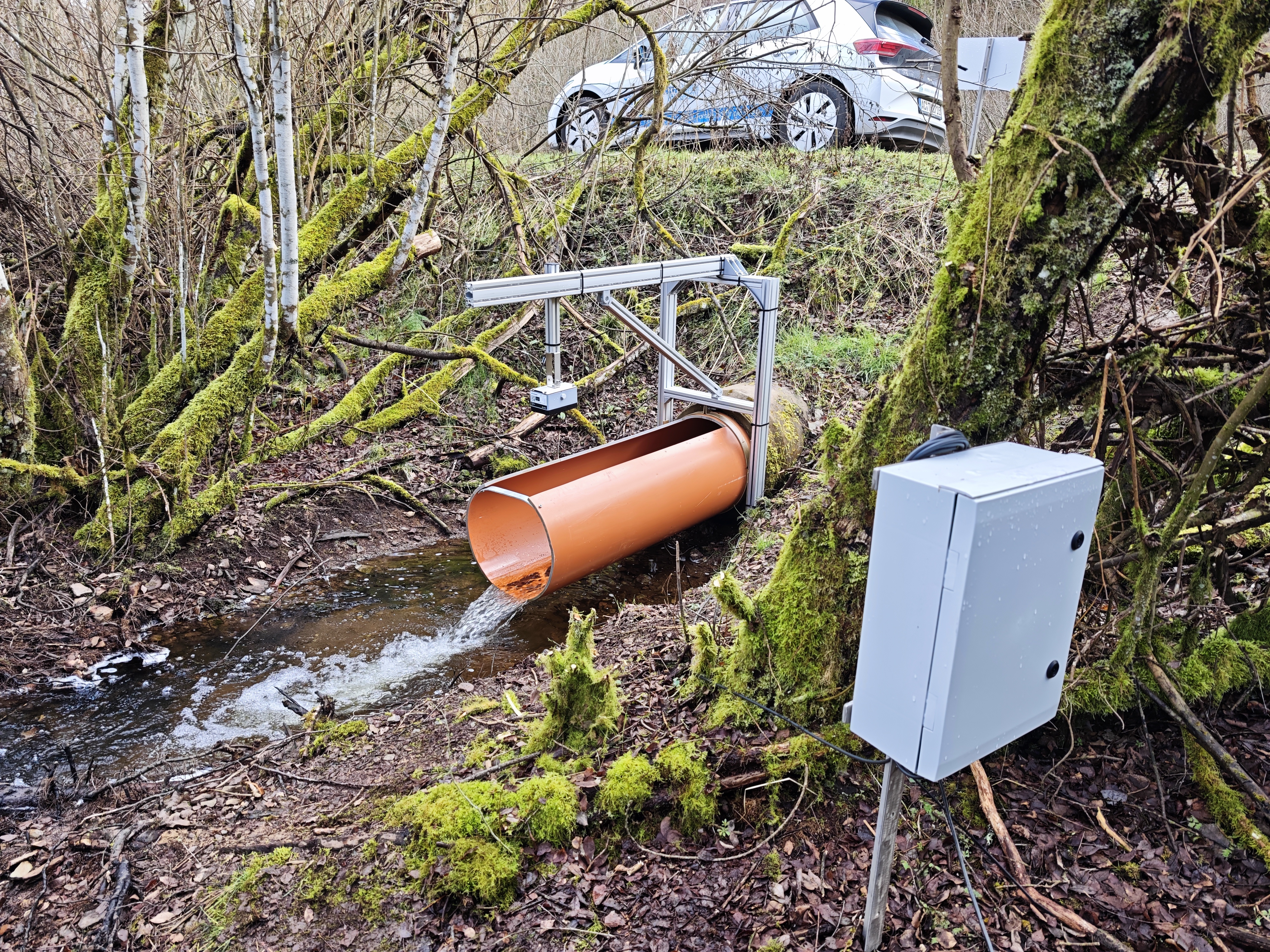Hydrological monitoring station at the catchment outlet, recording water level and flow velocity for restoration assessment
